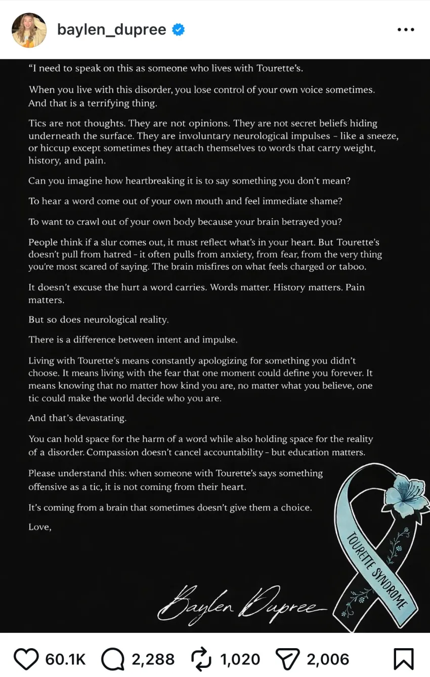 Baylen Dupree, estrella del programa “Baylen Out Loud”, emitió un comunicado sobre el arrebato de John Davidson durante los premios BAFTA. Davidson, que tiene síndrome de Tourette, fue noticia cuando gritó un insulto racial mientras Michael B. Jordan y Delroy Lindo presentaban durante el espectáculo.