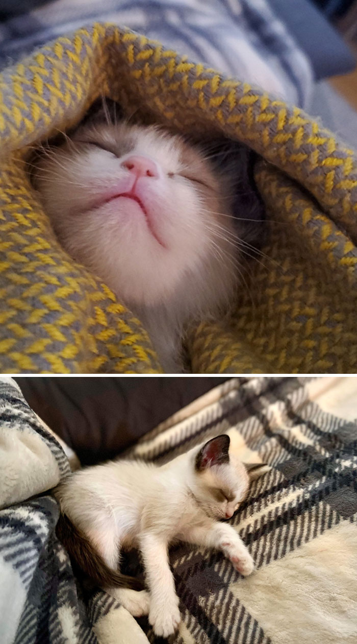 # 6 De repente durmió así mientras yo jugaba con ella. Era una gatita callejera, mi hermano la adoptó