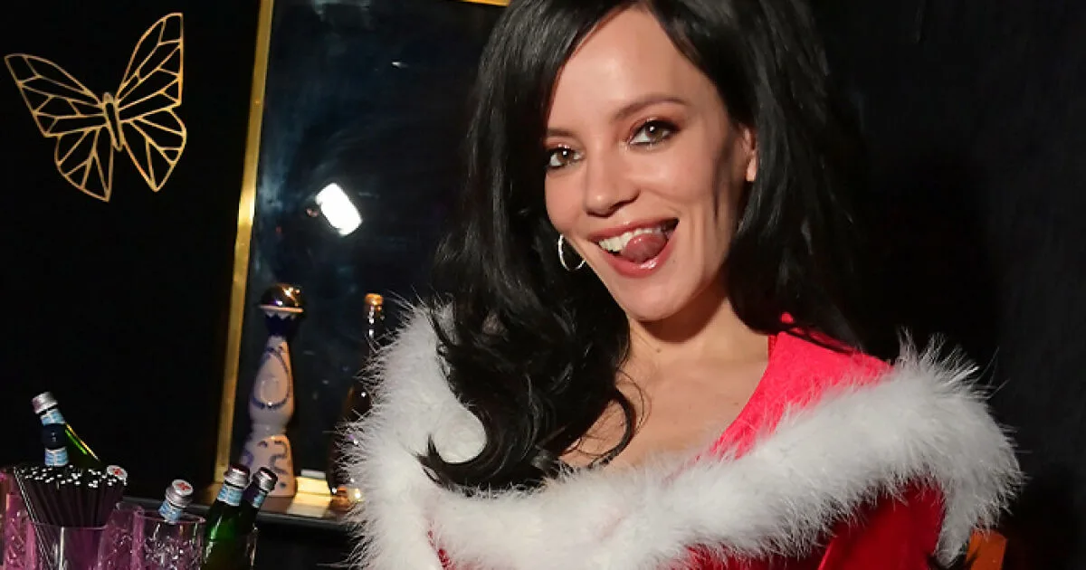 Lily Allen hizo una aparición dramática en su fiesta de Navidad en Londres. Se puso un minivestido de terciopelo rojo inspirado en Papá Noel adornado con pelo blanco. Allen completó su look con un abrigo largo a juego y medias blancas.