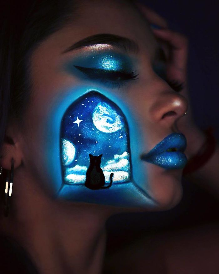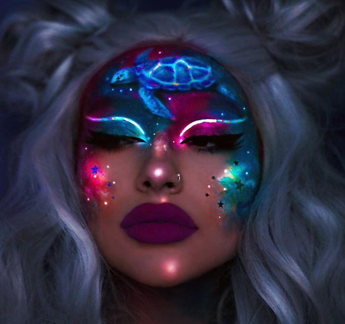 Pero quería llevar mi arte al siguiente nivel. Haz algo que nadie haya hecho antes. Así que un día, después de haberme hecho un maquillaje creativo para todo el rostro, comencé a jugar con la iluminación. Obtuve un efecto de brillo bastante bueno al cortar algunos agujeros en una camiseta negra y colocarla sobre mi softbox. Así fue como se me ocurrió la idea de maquillarme con luces que brillan en la oscuridad. Después de mucha práctica y errores, he aprendido a usar la pintura UV, la luz y también cómo puedo manipular la iluminación para imitar el genial efecto del maquillaje brillante.