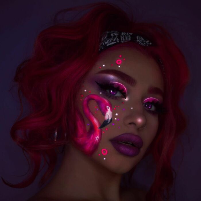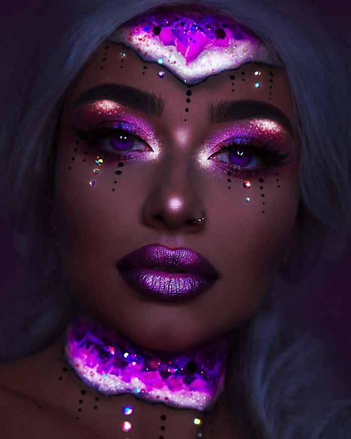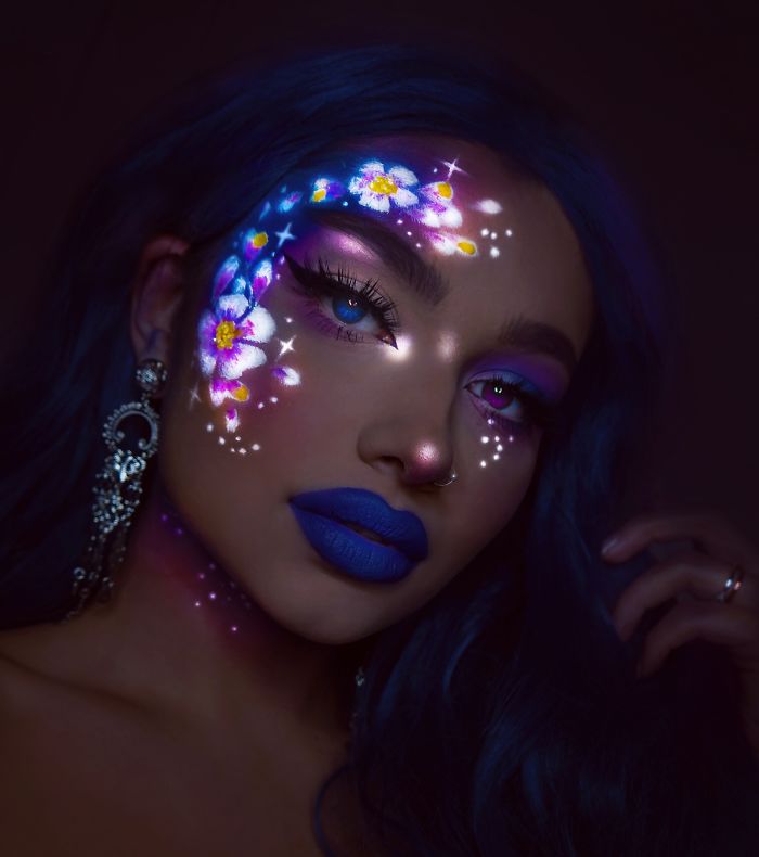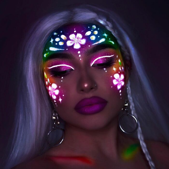 Looks de maquillaje que brillan en la oscuridad creados con luz y pintura UV 24 fotos