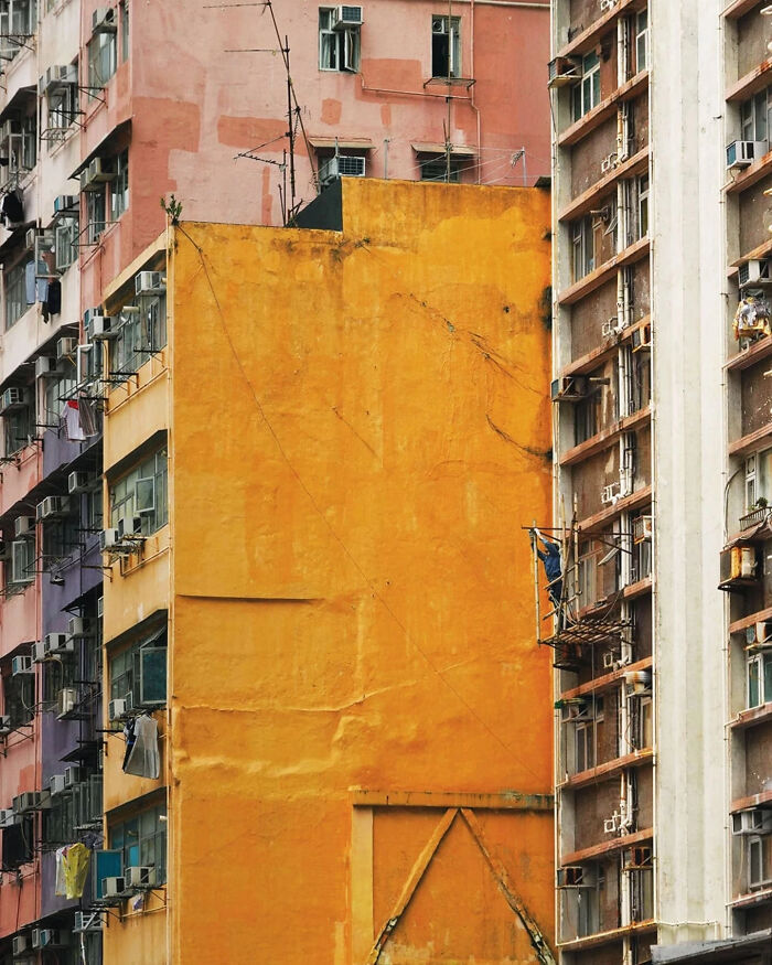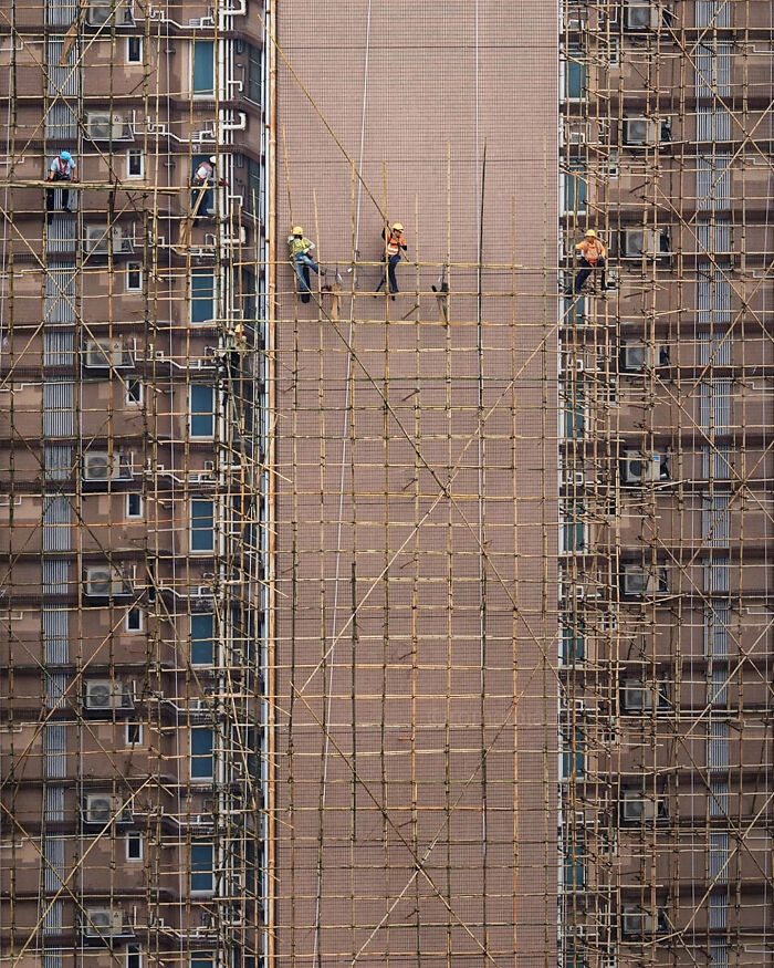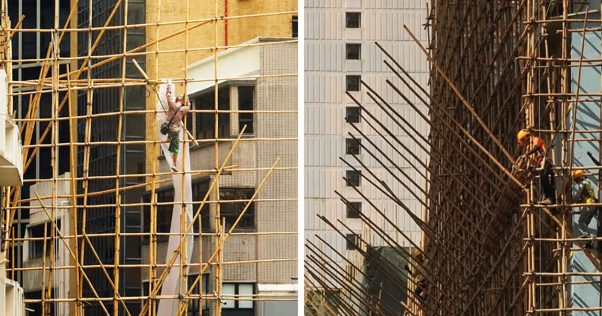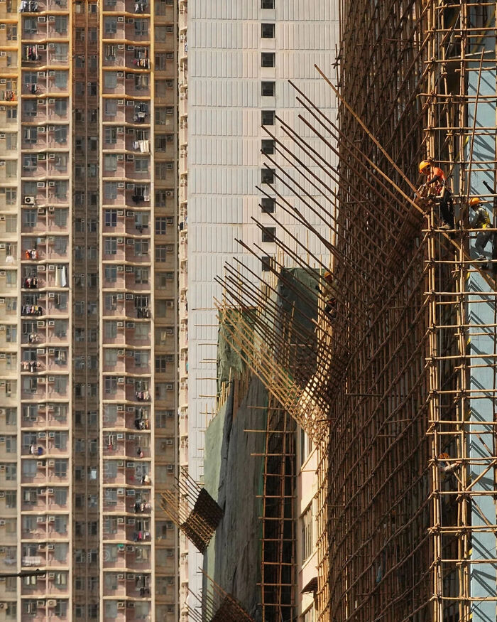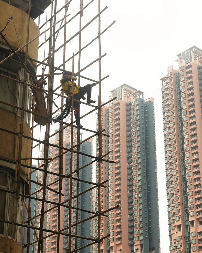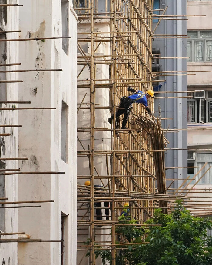 El andamio de bambú es una característica notable de la tradición de construcción de Hong Kong, particularmente para las renovaciones dentro de las densas áreas residenciales de la ciudad. Los trabajadores calificados que se especializan en este oficio son esenciales, proporcionando acceso a unidades individuales al tiempo que priorizan la seguridad y la eficiencia. Por lo general, se usan para la reparación de unidades de aire acondicionado, o para la eliminación de árboles cuyo crecimiento podría arriesgarse a afectar la estructura del edificio.
