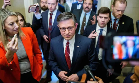 El expresidente republicano Donald Trump, acompañado, desde la derecha, por Melania Trump y Barron Trump, llega para hablar en una fiesta de observación de la noche...