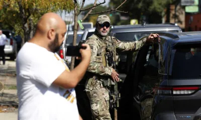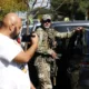 Un hombre sostiene su teléfono junto a un agente de la Patrulla Fronteriza de Aduanas y Protección Fronteriza (CBP) de EE. UU. durante una redada de...