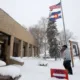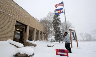 Un votante carga a su hijo mientras entra al Ayuntamiento de Oak Creek para dejar su boleta el día de las elecciones, el 5 de noviembre...