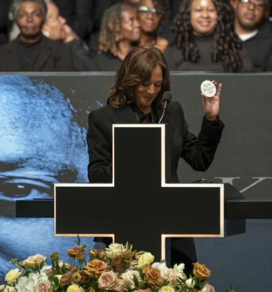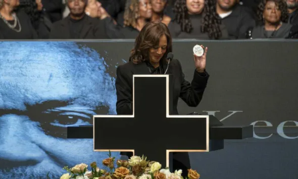 La ex vicepresidenta Kamala Harris sostiene un botón de campaña de la campaña presidencial del reverendo Jesse Jackson en 1988...
