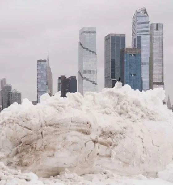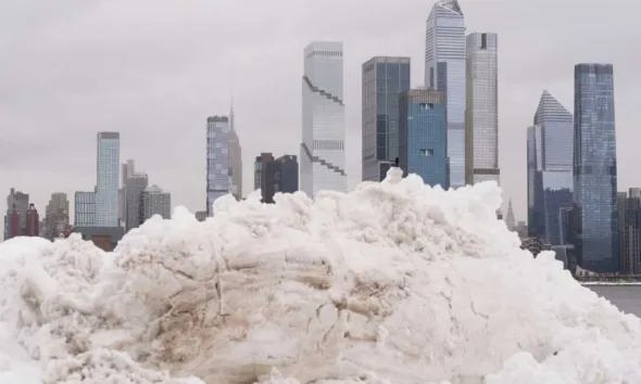 Un trozo del horizonte de Nueva York se eleva sobre un montón de nieve en el paseo marítimo de Weekhawken,...
