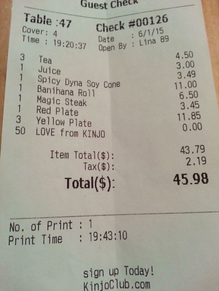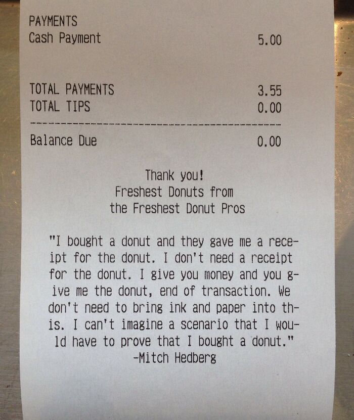 De hecho, a algunos cajeros les gusta ser creativos con los recibos que entregan a sus clientes. Ya sea un descuento en un restaurante «Love from KINJO» o algunas frases divertidas como «Mi abuelo tiene el corazón de un león… y una prohibición de por vida del zoológico de San Diego», las personas que trabajan en la caja registradora tienen una habilidad especial para darle vida a los aburridos recibos.