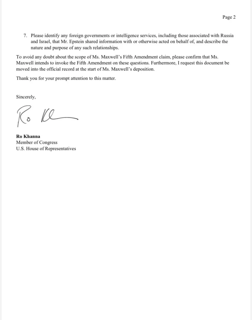 Ayer, Khanna también envió una carta formal (fechada el 8 de febrero de 2026) al presidente de supervisión, James Comer, antes de la declaración programada de Maxwell.