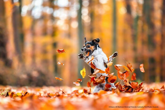 «Crazy in Love With Fall» de Diana Jill Mehner. «Esta es Leia. Como puede ver, definitivamente le encanta jugar con todas las hojas en otoño, y sí, fue realmente complicado tomar esta foto porque nunca se sabe dónde actuará el perro y qué hará a continuación: D»