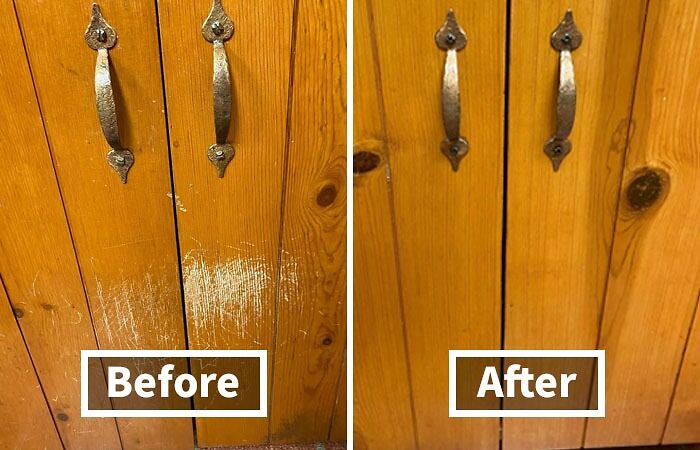 Revisar: «Mi esposo es carpintero y había construido hermosos gabinetes de cocina de pino hace varios años. Cuando nuestro perro era un cachorro, los arañaba muchísimo. Pensé en probar Old English Scratch Cover, pero no tenía muchas esperanzas de que funcionara. ¡Los resultados fueron increíbles! ¡Los gabinetes parecen nuevos!» – Anónimo
